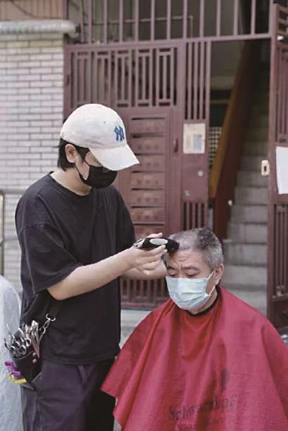 在发布公告的第二天——五四青年节当天,康泰公寓“公益理发店”就在小区内开张了。三位理发师一字排开,志愿者们维护秩序,按照报名顺序逐一叫居民下来理发,避免人群聚集。为确保安全,每一位前来理发的居民还需出示核酸报告。整个公益理发秩序井然,好评如潮。