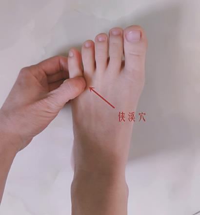 侠溪穴位于人体的足背外侧,当第4、5趾间,趾蹼缘后方赤白肉际处,是足少阳胆经上的一个穴位,我们用拇指和食指点揉10分钟即可,急性腰痛的症状就会得到明显改善。