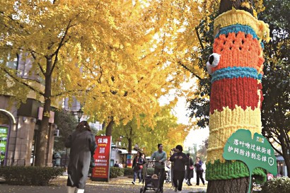 步道两旁,十余株银杏树悄悄换上了手工编织的彩色毛衣。这些毛衣质地柔软,色彩明快,织着可爱的卡通图案,在满目金黄的季节里,添上一抹治愈的暖意。走近看,毛衣上悬挂着小巧的亚克力标牌,如同一枚枚落在织物上的“知识书签”。上面写着简洁易懂的普法短句:“秋日金叶轻轻摇,少年上网要牢记”“金黄满街映秋意,净网护苗暖心底”……毛衣为树御寒,标语为孩子护航,法律不再是遥远的条文,而是像这毛线一般,织进生活肌理里的柔软守护。