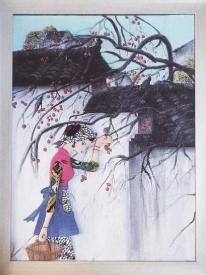 在虹桥手作人基地“虹馆”,展出了一幅由刘光彩和史莺共同完成的布艺贴画。作品中,背景是一座青瓦白墙的古镇村落,近景是一个身着传统虹桥乡村服饰的女孩,头戴青布白花头巾,手里拎着一个竹篮,正从一棵柿子树底下走过。红彤彤的柿子挂在枝头,映得女孩的脸颊都羞了……在史莺完成了油画基底后,刘光彩用布艺贴画完成了人物创作,将曾经的虹桥乡村风光以立体的形式呈现出来,画面栩栩如生。刘光彩介绍说,自己作为一名土生土长的虹桥人,用布艺贴画这一艺术形式将儿时记忆中的场景呈现出来,希望可以“留住乡愁”。“随着虹桥镇的快速发展,曾经的乡村景象不复存在。但好在我有布艺贴画,能将这些记忆留住。”