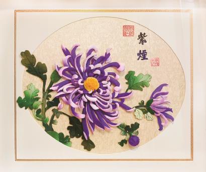 在收获越来越多成就感的同时,刘光彩和她的徒弟们也在思考:如何让布艺贴画这项传统技艺焕发新生?在不断的实践中,她们找到了答案:守正创新。在制作工艺上,她们将扎染、盘扣、掐丝珐琅等多项传统技艺与布艺贴画融合在一起;在创作题材上,除了传统的题材,她们还不断尝试与上海元素、虹桥元素结合在一起,让布艺贴画作品反映时代变迁,记录发展历程。