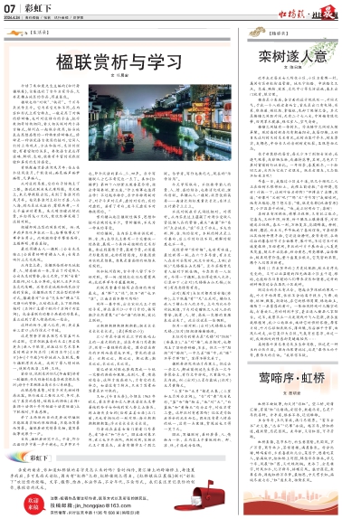 从内容上看,该楹联恰到好处地把景、人、情感融为一体,写出了对受联人公台先生的赞誉,含义无穷。下联“台甫”是敬词,对人表示尊称。受联人名声不仅在文化范畴,还有历史地域和纯民俗方面的贡献。该楹联运用了混合型的修辞方式,蕴藏着对“公台”先生和“横山”文化期刊的赞誉。从结构上看,上下联词性相对(名词十主谓十疑问十名词十形容词),包含着联句的整个画面的形象美。真正达到了景人情感的统一结合。