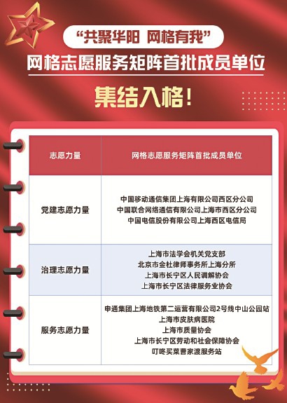 日前,首批网格志愿服务成员单位,包括中国移动、中国联通、中国电信、申通集团上海地铁第二运营有限公司、上海市法学会、金杜律师事务所、上海市质量协会、上海市皮肤病医院等在内作为网格社会资源入驻。
