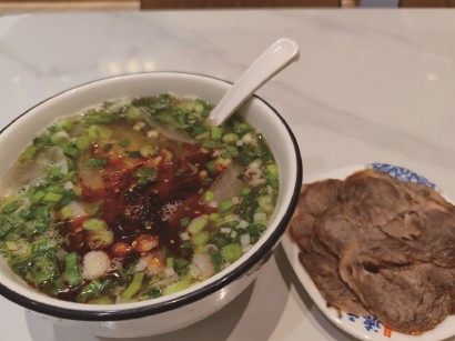 没等多久,面就做好了。面上淋了辣子油,“一清二白三红四绿”,清清亮亮的汤头,衬着红的辣子、绿的香菜葱花,看着就叫人胃口大开。挑起一筷子面尝尝,筋道爽滑,清爽利落。汤里还有切成丁的牛肉,炖得软糯,入口即化。
