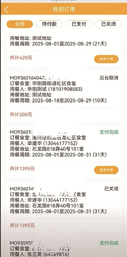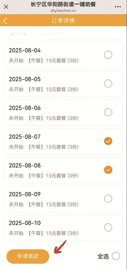 点击“我的订单”,即可查询到订单明细,点击“查看详情”,即可查询所有的订餐时间,选择具体的时间即可提交退款申请。