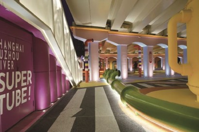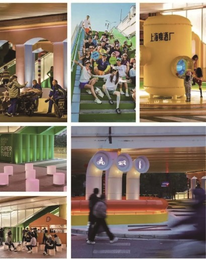 苏河超级管位于长宁区江苏北路与万航渡路交叉口,是苏州河桥下文化休闲带的重要公共空间。设计以“管道+色彩”为核心思路,将废旧工业管道转化为景观节点,用弧形钢板包裹桥下空间、彩色钢管装饰设施,致敬上海仓储罐、啤酒桶等工业历史;同时融入上海俚语、涂鸦等“彩蛋”,打造出人气爆棚的童趣“梦核公园”。
