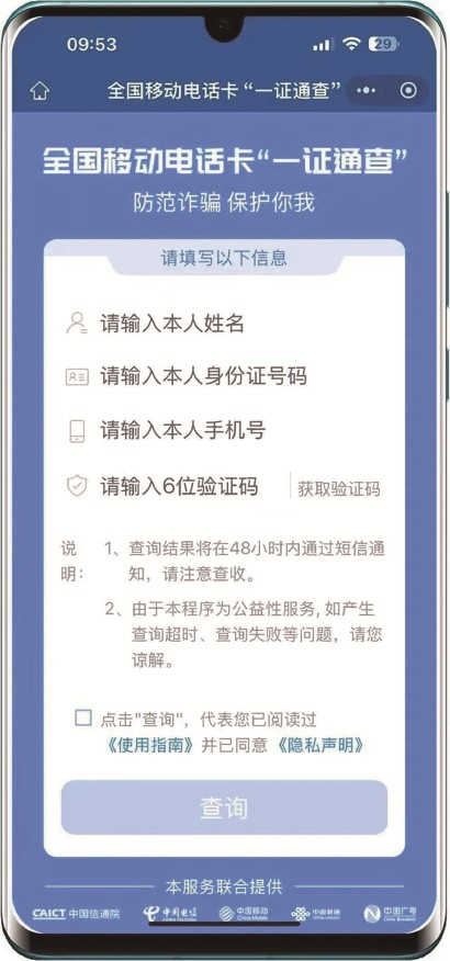 ①扫一扫进入国务院客户端小程序“电话卡‘一证通查’”服务
