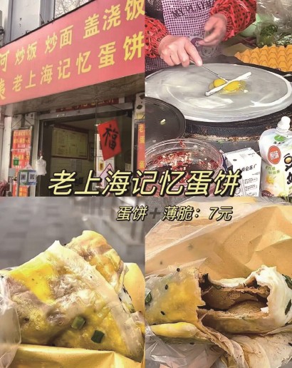 在老上海记忆蛋饼摊前,总围着上班族与学生。面糊在铁板上摊成完美的圆形,打蛋、撒葱、翻面、刷酱,一套动作行云流水。握着这份热乎的早点,仿佛也握住了上海清晨的脉搏。