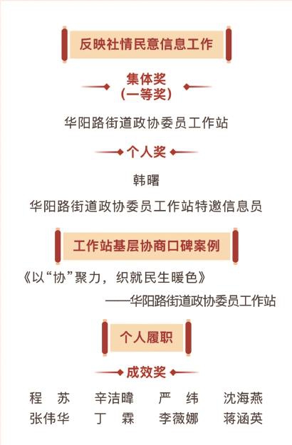 华阳路街道政协委员工作站现有入站委员34名,其中市政协委员7名,区政协委员27名,涉及界别18个。2025年,工作站在区政协指导下,以习近平新时代中国特色社会主义思想为指导,深化拓展新时代“凝聚力工程”,推动政协协商与基层协商深度融合,广泛凝聚人心、凝聚共识、凝聚智慧、凝聚力量,为华阳高质量发展贡献政协智慧和力量。