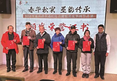 近日,由虹口区文旅局指导,嘉兴路街道党工委、办事处主办的“春华秋实·墨韵传承”2026年嘉兴路街道红叶书画院师生书画作品展在虹口区图书馆·和平书院展厅开幕,集中展现了嘉兴路街道与红叶书画院携手推动公益教学、传承优秀传统文化的丰硕成果。