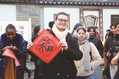 “你看,这副春联上的字,书法家师傅告诉我是‘财源涌进积善家’!”来自法国巴黎的留学生Roman手捧刚领到的春联,一边展示一边笑着说,“虽然我学习中文的时间不算太长,但我能听懂‘财源涌进’的意思,就是希望我今年能赚到很多钱,太吉利、太贴心了!”他还坦言,这是他第一次近距离感受中国春联文化,现场的锣鼓声、欢呼声,还有大家脸上的笑容,都让他感受到了浓浓的幸福感,“中国的新春活动真的太热闹、太有感染力了,我太喜欢这种氛围了。”
