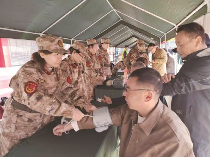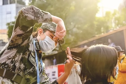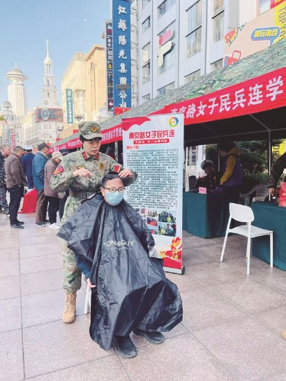 每月20日是南京路为民服务活动的日子。当天早上6点不到,迷彩大棚内,一群身着迷彩绿的女子民兵,正在紧锣密鼓地展开血压计、血糖仪、理发器、针线包等工具,热情洋溢地为附近居住的群众和过往的游客提供服务……一位刚测过血糖的阿婆牵着女民兵的手问:“你们是哪里的部队啊?”“阿婆,我们是南京路女子民兵连。”队员陈婷婷骄傲地回答。