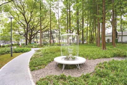 森邻花园位于武胜路、威海路与黄陂北路交叉口,以打造街区邻里“绿核”为目标,通过“社区植物园”建设,将绿色蔓延、渗透到街区各个公共空间,推动塑造完整的“绿核+绿脉+绿心”的公园型街区格局。建设过程中,充分保护和利用绿地大乔木资源,结合水杉林和香樟林的林下空间特点,引入蕨类、苔藓等植物种群,打造城市森林中的“孢子植物园”,通过木桩、砂石等造景,重现自然感和生态感的森林景观,并结合城市生物多样性保护,设置科普宣传牌和科普艺术装置,打造可阅读、可互动、可停留的“科普植物园”,推动形成一处鼓励市民亲近自然的市中心“好奇心研究所”。