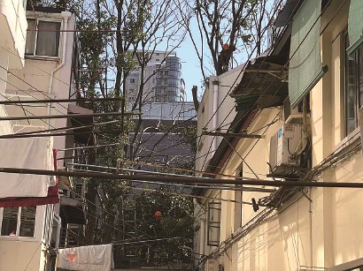 原来,这位居民居住在升平街79弄小区的东侧,与上汽集团的花园仅一墙之隔。花园里的树木长势良好,异常繁茂,足有六七层楼那么高,肆意生长的枝叶也给居民带来了诸多困扰:大量落叶堆积在小区楼顶,堵塞了排水沟,进而引发高层楼的住户家里漏水;每到夏日,蚊虫等大量孳生,惹得居民不敢开窗;此外,常年被茂密的枝叶遮挡,居民家里常年光照不足,难以通风,家中阴暗潮湿……