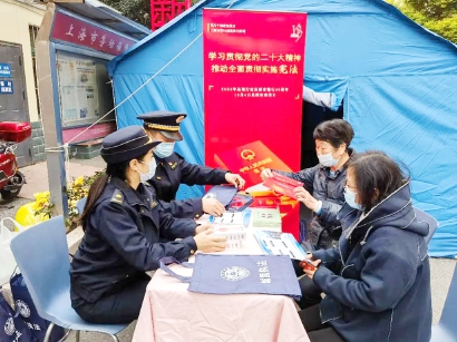 2022年是我国现行宪法公布实施四十周年。今年12月4日是第九个国家宪法日,也是上海市第三十四届宪法宣传周。为进一步推进普法和依法治理工作,欧阳路街道综合行政执法队在辖区内开展系列宪法宣传活动,让宪法家喻户晓、深入人心。