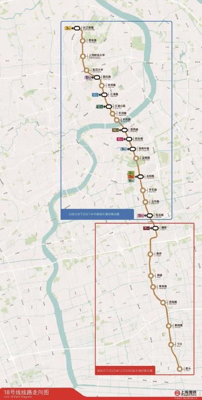 18号线一期北段起自南段御桥站,止于长江南路站,途经浦东新区、杨浦区、宝山区,设18座车站,其中9座车站可与12条城市轨道交通线路实现换乘。其中,龙阳路站可与地铁2号线、7号线、16号线、18号线,以及磁悬浮实现换乘,将成为上海唯一一座“五线换乘”的车站。