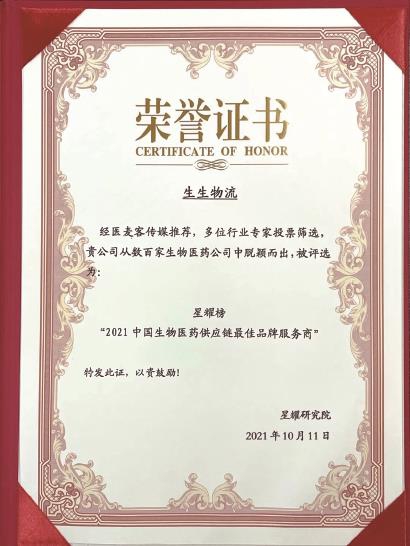 峰会持续两天,除讨论了生物医药与智慧医疗产业转型与布局、生物创新药产业投资策略、生物创新药国际化视野等热门话题外,还举办了“星耀榜”的颁奖典礼,经医麦客传媒推荐,多位行家专家投票筛选,上海生生物流有限公司从数百家生物医药企业中脱颖而出,荣获星耀研究院颁发的“2021中国生物医药供应链最佳品牌服务商”称号。