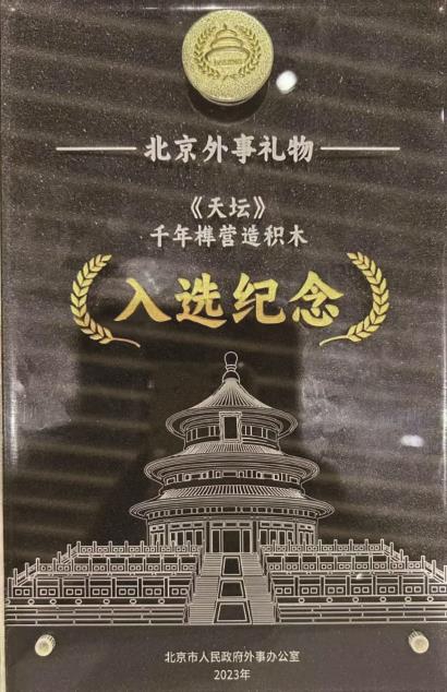 近日,由闵行华漕匠人王震华设计的榫卯产品“《天坛》千年榫营造积木”被北京市人民政府外事办公室选为“北京外事礼物”,并授予纪念奖牌,纳入北京外事礼物储备库,向外事部门和社会广泛推荐。