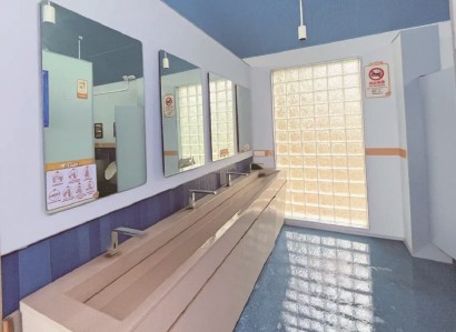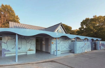 这座坐落于鹿鸣影苑东侧的水经公厕,水纹波浪形屋檐灵动别致,外墙采用蓝白色马赛克精心拼贴,勾勒出苏州河水域分布图,营造出与水共生的清新视觉感受,也呼应了赵家村“苏州河第一村”的地域特质。