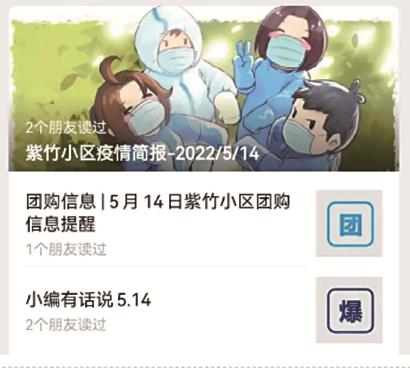 紫竹小区是一个有着2800余位居民的动迁房老旧小区,其中上了年纪的老年人居多,65岁以上的占三分之一,高龄独居老人有五十多位。四月中旬,由新泾镇刘二居民区的居民自发提议、在刘二居民区党总支的大力支持和指导下,成立了微信公众号——“紫竹情报站”。“紫竹情报站”以图片海报、文字故事等形式,及时推送社区疫情简报、团购信息、志愿者故事等,虽然创办不久,但已成为居民每天必读的“晚报”,在让居民安心居家积极配合防疫工作的同时,也让邻里之间互帮互助的故事得以弘扬。