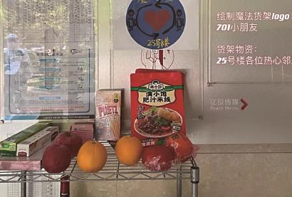 持续一个多月的封闭管理,25号楼栋不但建立了线上“志愿者服务群”,还有居民在大堂搭建起“魔法货架”,交换蔬果、零食等。“魔法货架”形成后,有居民给楼道购买了消杀酒精、“大白”服装等诸多防疫用品,供居民随时取用;有居民把家中闲置的轮椅贡献出来,借给行动不便的老人使用。“魔法货架”上的物资简直成为了一池“活水”,一边源源不断地从居民家中涌入,一边流到有需要的居民手中。点滴的善意在25号楼的“魔法货架”里汇聚成了强劲的暖流,将人与人之间的真情,传递到了小区的角角落落。