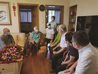 8月31日上午,上海市老年基金会副理事长兼秘书长孙萍、副理事长汤慧、长宁区代表处会长鲁德喜、玉佛禅寺慧觉法师等一行在新泾镇党委书记卞晓清、副镇长殷晖的陪同下,到绿园五村百岁老人龚韵璋的家中走访慰问,为老人送上中秋佳节的问候与祝福。