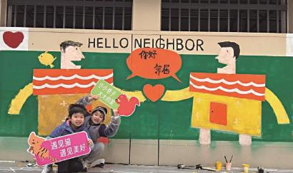 还有一些小朋友则直接在墙上向自己的邻居“表白”:“你好,邻居”“我和我亲爱的邻居们”……质朴的话语、真挚的童心,让社区更温馨。一名小男孩以墙为媒,留下了自己的谢意:“因为我的邻居在疫情的时候给了我很多的帮助,所以我想写下这句话来感谢邻居。”简单醒目的文字、彩色绚丽的画面背景让路过的居民们纷纷驻足观看,拍照留念。