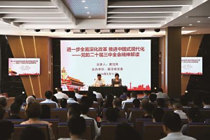 会议邀请了上海市学习贯彻党的二十届三中全会精神宣讲团成员、市委党校经济学教研部主任唐珏岚教授作《进一步全面深化改革推进中国式现代化——党的二十届三中全会精神解读》专题报告。唐教授从“党的二十届三中全会召开的深刻背景与重大意义”“党的二十届三中全会《决定》的基本框架与核心要义”和“学习贯彻党的二十届三中全会精神的重大部署与基本要求”等方面,系统解读了党的二十届三中全会精神。