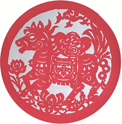 在这张完整的红纸上,骏马灵动鲜活,周身更融入了丰富的中国传统吉祥元素:彩云寓意祥瑞环绕,牡丹花承载富贵美满,飞鸽传递和平安详,元宝与钱币寄托着对日子蒸蒸日上的期盼,莲花象征做人清清白白,鲤鱼则含有“年年有余”的美好祝愿。