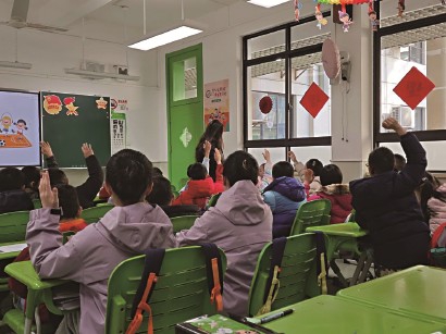 在环保小达人系列课程中,孩子们用废旧纸张制作新年许愿树;在“守护生态家园 未来地球合伙人”课堂上,孩子们通过垃圾分类互动游戏,了解野生动物保护的意义与绿色上海的理念。
