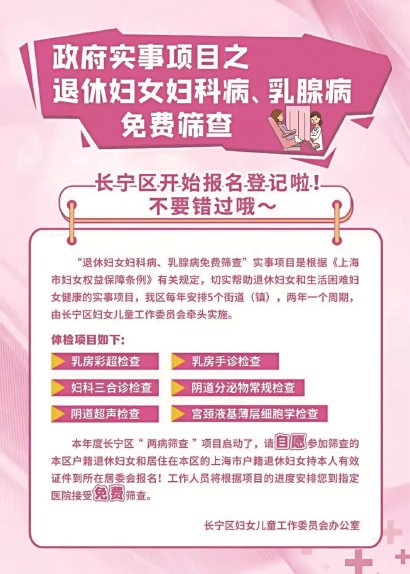 2026年长宁区退休妇女妇科病、乳腺病免费筛查项目正式启动,请自愿参加筛查的本镇户籍退休妇女和居住在本镇的上海市户籍退休妇女即日起至3月20日持本人退休证(或有效退休证明)和身份证到所在居委会报名(请参加筛查的妇女注意报名时间段,不要错过报名),工作人员将根据项目的进度安排您到指定医院接受免费筛查。