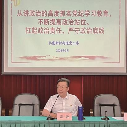 6月24日上午,仙霞新村街道党工委书记、人大工委主任高峥以《从讲政治的高度抓实党纪学习教育,不断提高政治站位、扛起政治责任、严守政治底线》为主题讲纪律党课。街道党工委副书记、办事处主任葛敏主持会议。街道班子成员、直属支部书记、各居民区党总支书记、机关全体党员、部分两新党组织书记代表参加。
