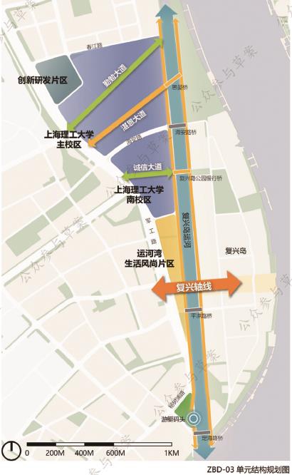 3单元为上海理工大学区域。未来将推进上海理工大学校园全面开放和功能拓展强化校城融合。以湛恩大道为核心的空间轴线,通过打开校园特色历史建筑界面,向公众展示校园历史文化底蕴,打造“城市里的大学”。结合复兴岛运河规划联动发展,打造一条既充满活力、生态宜居,又富有独特人文历史特色的滨水岸线。
