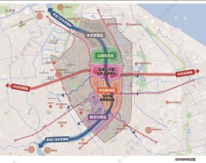 “两轴”为黄浦江沿岸综合发展轴和翔殷路-五洲大道科创发展轴。南北向综合发展轴延续黄浦江核心段发展势能,带动北滨江沿岸和腹地提升,衔接大都市圈长江口战略片区科创网络,辐射南通、苏州等城市提升上海科创门户高地的影响力和综合实力;东西向科创发展轴联动五角场和杨浦大学集聚区,串联金桥副中心、外高桥产业区和港区,强化产学研一体联动。