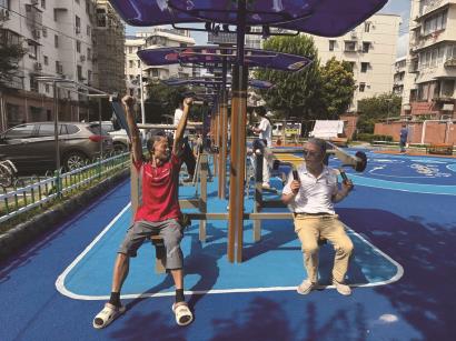 明快的蓝橙色塑胶地面上,一岁萌娃兴奋地咿呀学步;椭圆机上阿姨缓步慢行,老伯和小伙子在健身车上较劲,谁也不愿服输。在开鲁二村健身苑点,曾经设施老化的社区角落,如今已成为居民日常锻炼的热门去处。器材数量虽不多,但功能齐全,十余种全新设备满足全年龄段多元需求,个性化游乐区还融入了老上海人熟悉的弄堂游戏元素。“孩子玩得安全,我们老人也能活动筋骨,这改造真是改到我们心坎里了!”居民王女士感慨。